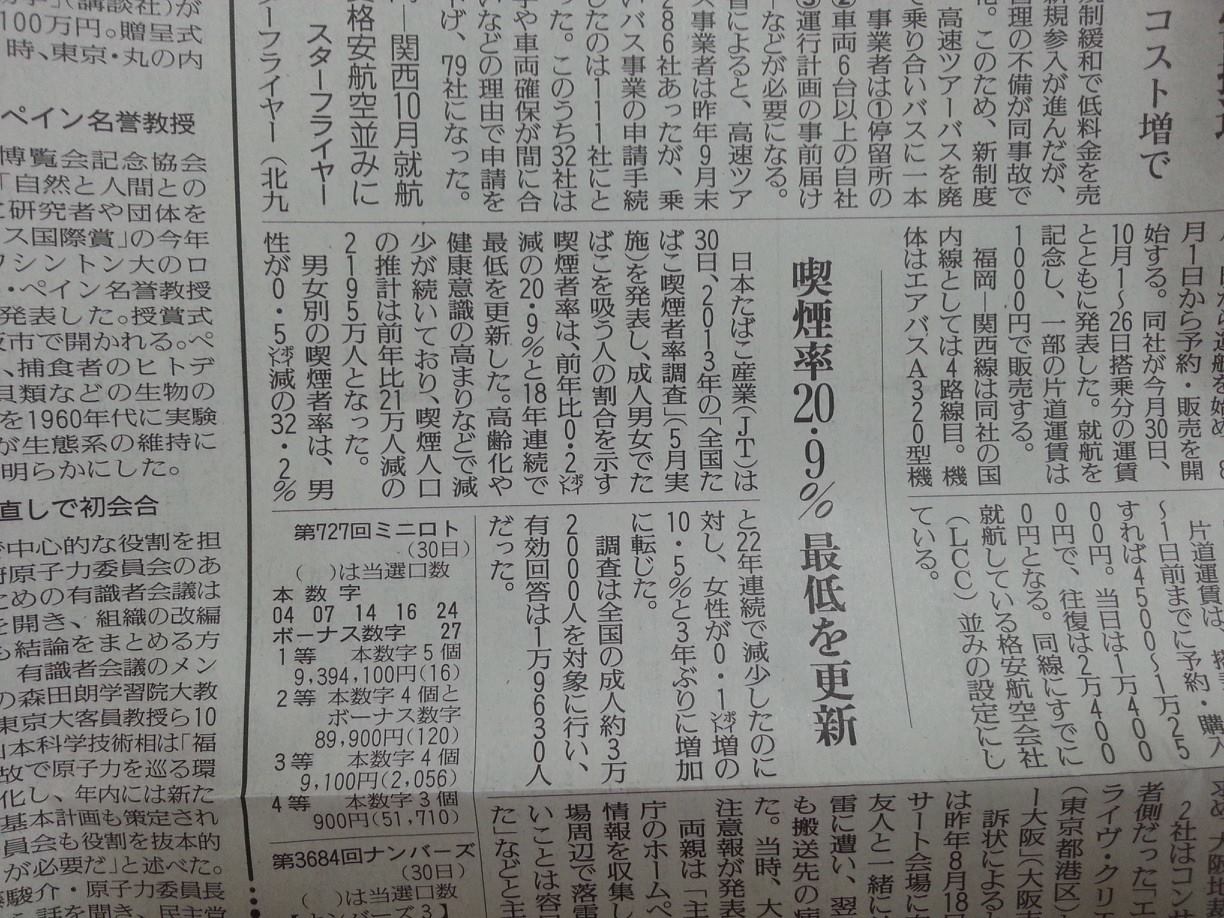 今朝の読売朝刊にタバコ喫煙者がここまで減少したかといった記事が掲載されていた。